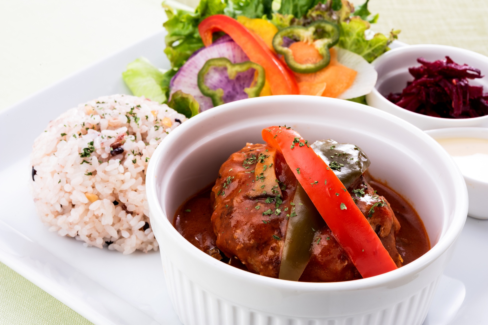 無添加のカレー粉とスパイスを使用。湘南みやじ豚のひき肉を贅沢に使用し、十八穀米との相性抜群。